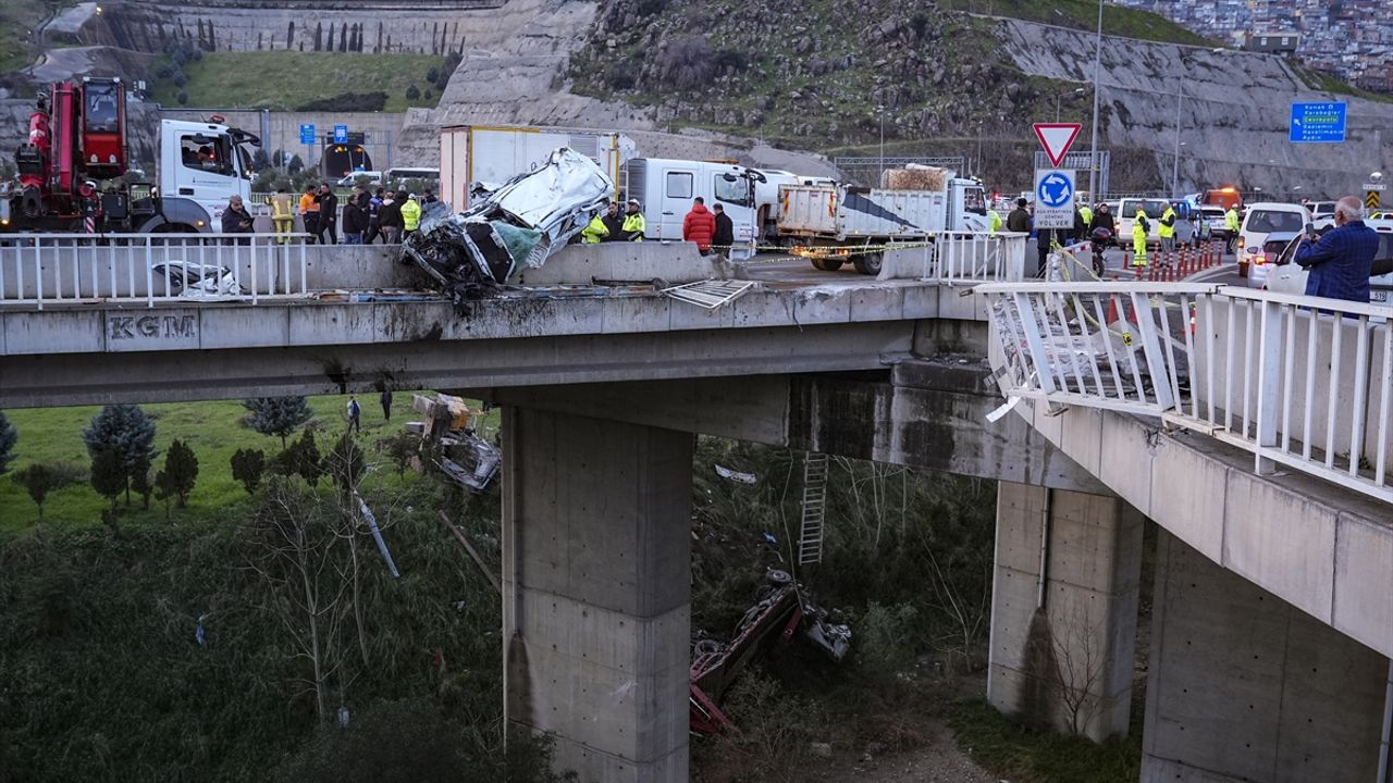 Çarpışmanın etkisiyle ekskavatör yüklü tır yaklaşık 30 metre yükseklikten zemine düşerken, hafif ticari araç viyadük bariyerinde asılı kaldı. Kazada 3 kişi yaralandı.