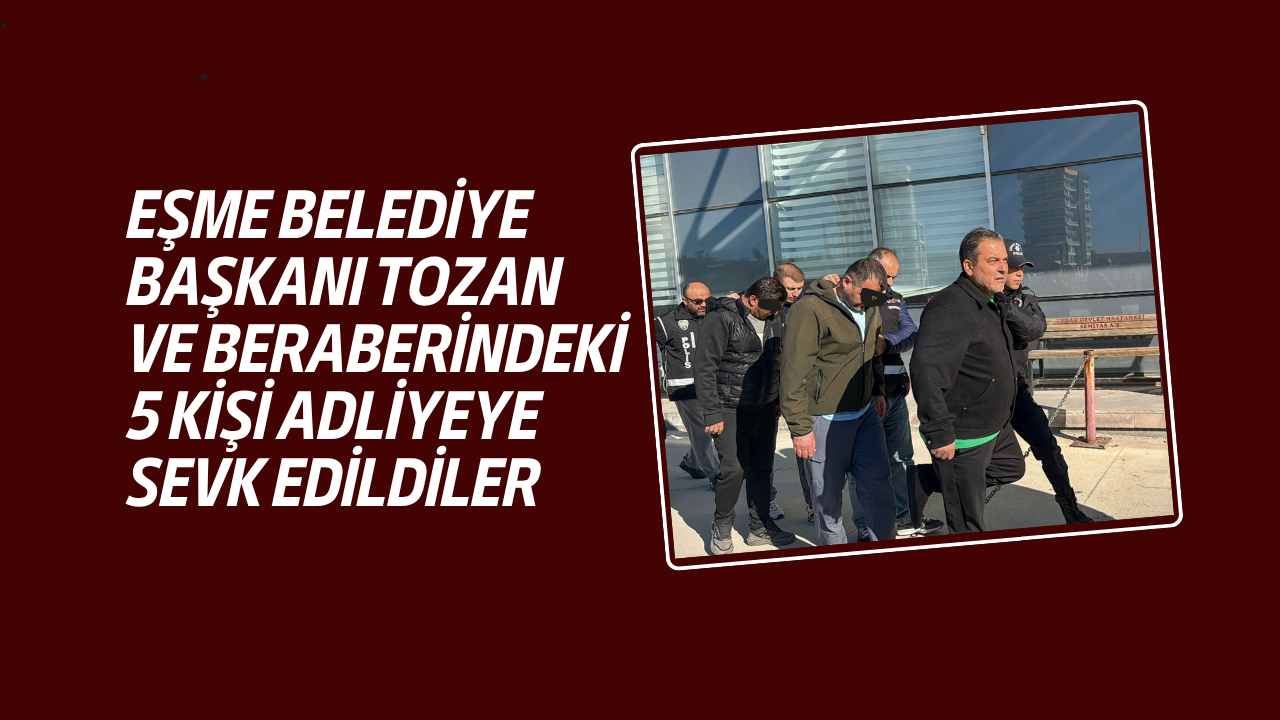 Uşak’ın Eşme İlçe Belediye Başkanı Yılmaz Tozan’ın ve eşi Burcu Tozan’ın gözaltına alındığı operasyonun ardından, toplam 6 kişinin bugün Eşme Adliyesine çıkarılacağı bildirildi. Uşak’ın Eşme ilçesinde geçtiğimiz Cuma günü yapılan operasyonla 1’i tutuklu olan toplam 6 kişi hakkında gözaltı kararı alındı. Yılmaz Tozan ve eşi Burcu Tozan’ın aralarında bulunduğu 6 kişinin Uşak İl Emniyet Müdürlüğü KOM Şube Müdürlüğü’ndeki sorguları tamamlandı. Edindiğimiz bilgilere göre söz konusu kişilerin Uşak’ın Eşme İlçesi’nde bulunan Adliye binasına sevk edilecekleri ve burada ifadelerinin alınacağı öğrenildi. İfadelerinin alınmasının ardından 6 kişinin mahkemeye sevk edileceği ve burada tutuklama kararı verilip verilmeyeceği de netleşecek.