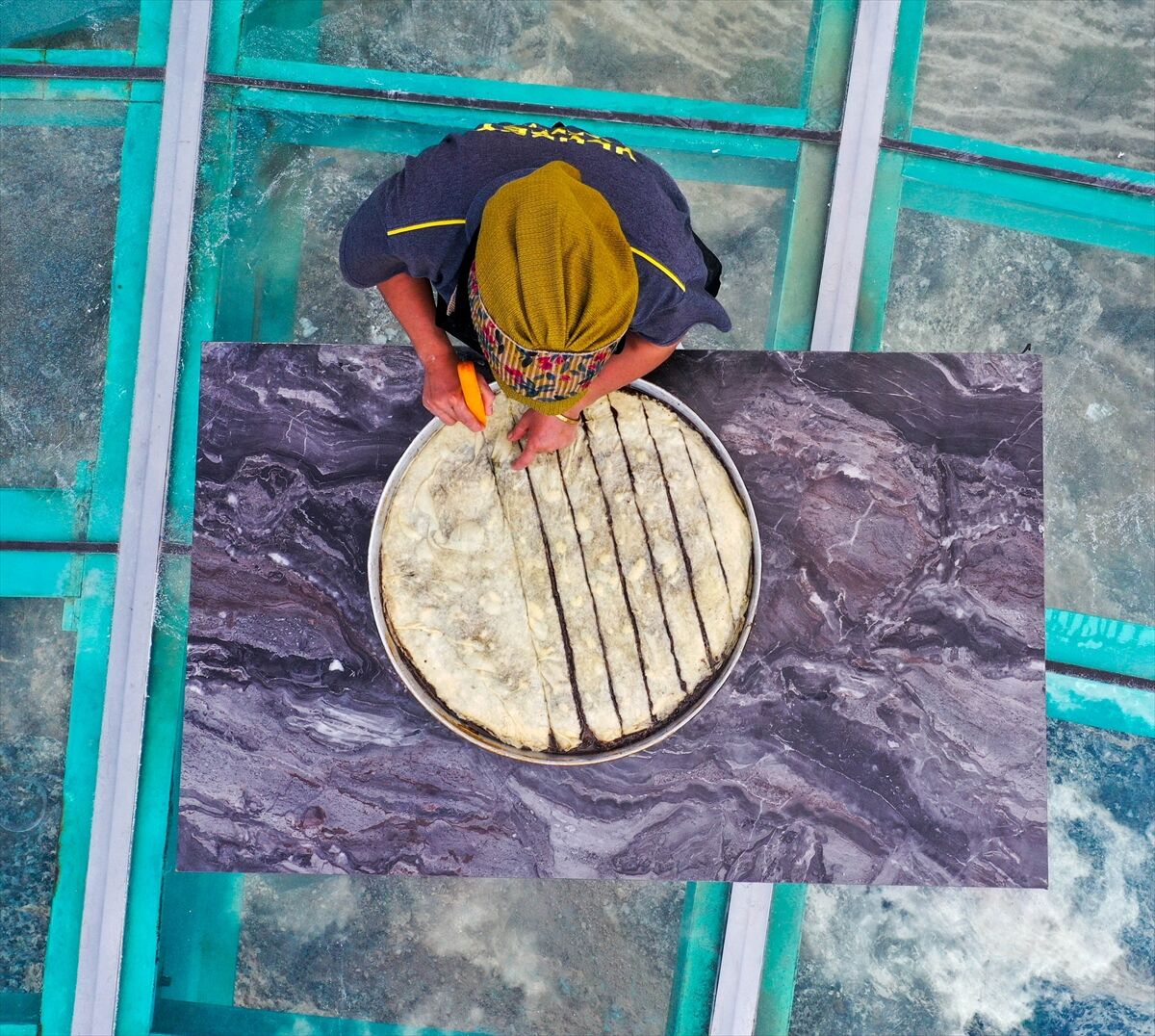 9 su bardağı un, hamur yoğurulabilecek bir kaba konulur, üzerine 1 çay kaşığı tuz ve 1 paket kuru maya eklenir. Kabın içindeki malzemelerin içerisine 1 litre suyun yarısı eklenir ve yoğurmaya başlanır. Hamur kulak memesi yumuşaklığı kıvamını alana kadar su eklenerek yoğrulmaya devam edilir. Hamur istenilen kıvama geldikten sonra üzeri bir bezle örtülerek mayalanması için 10 dakika bekletilir.