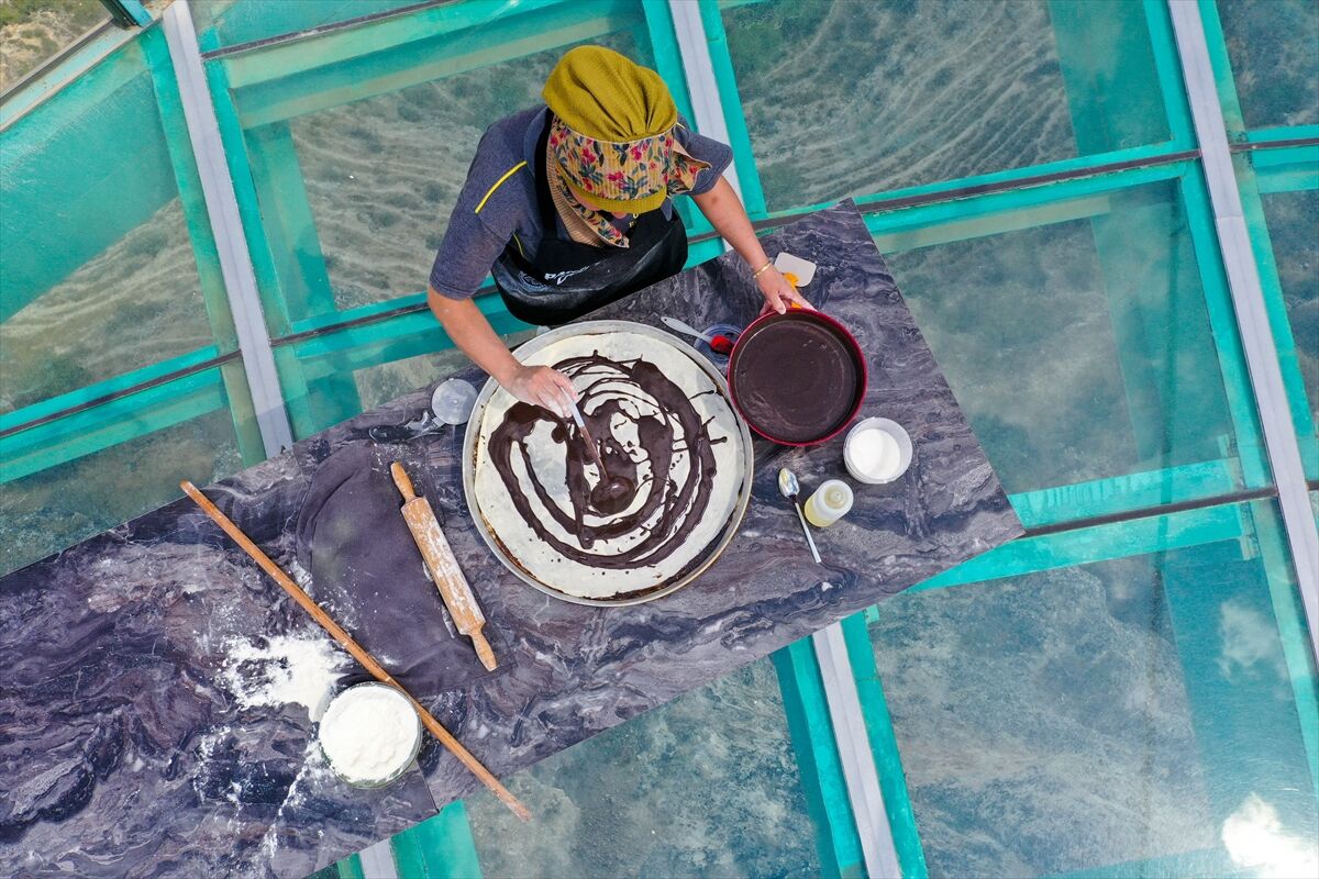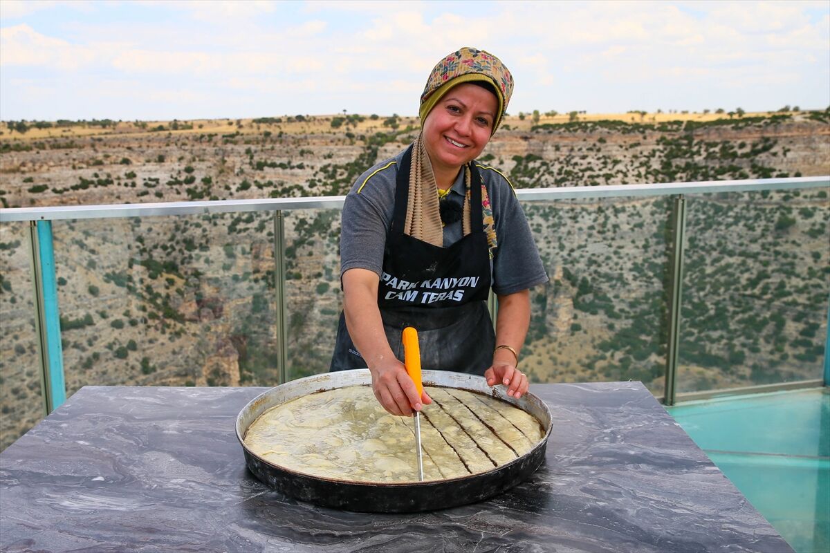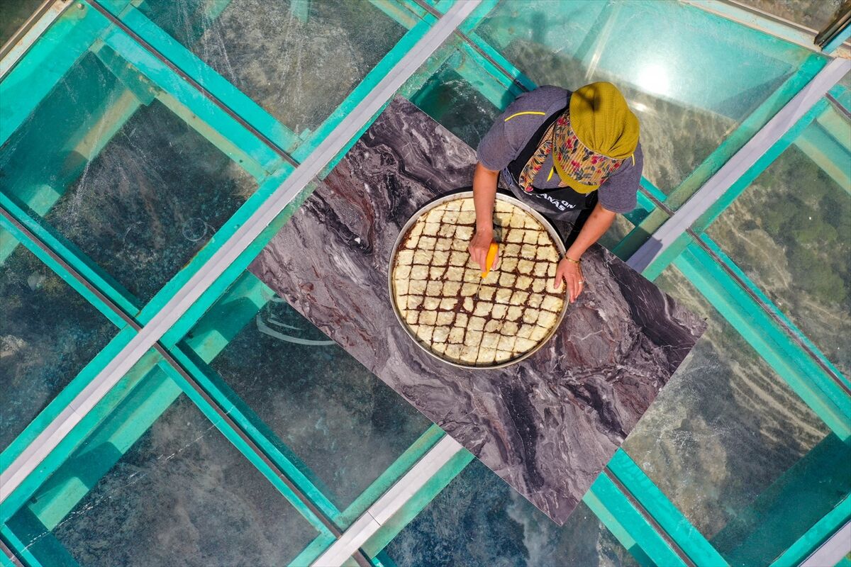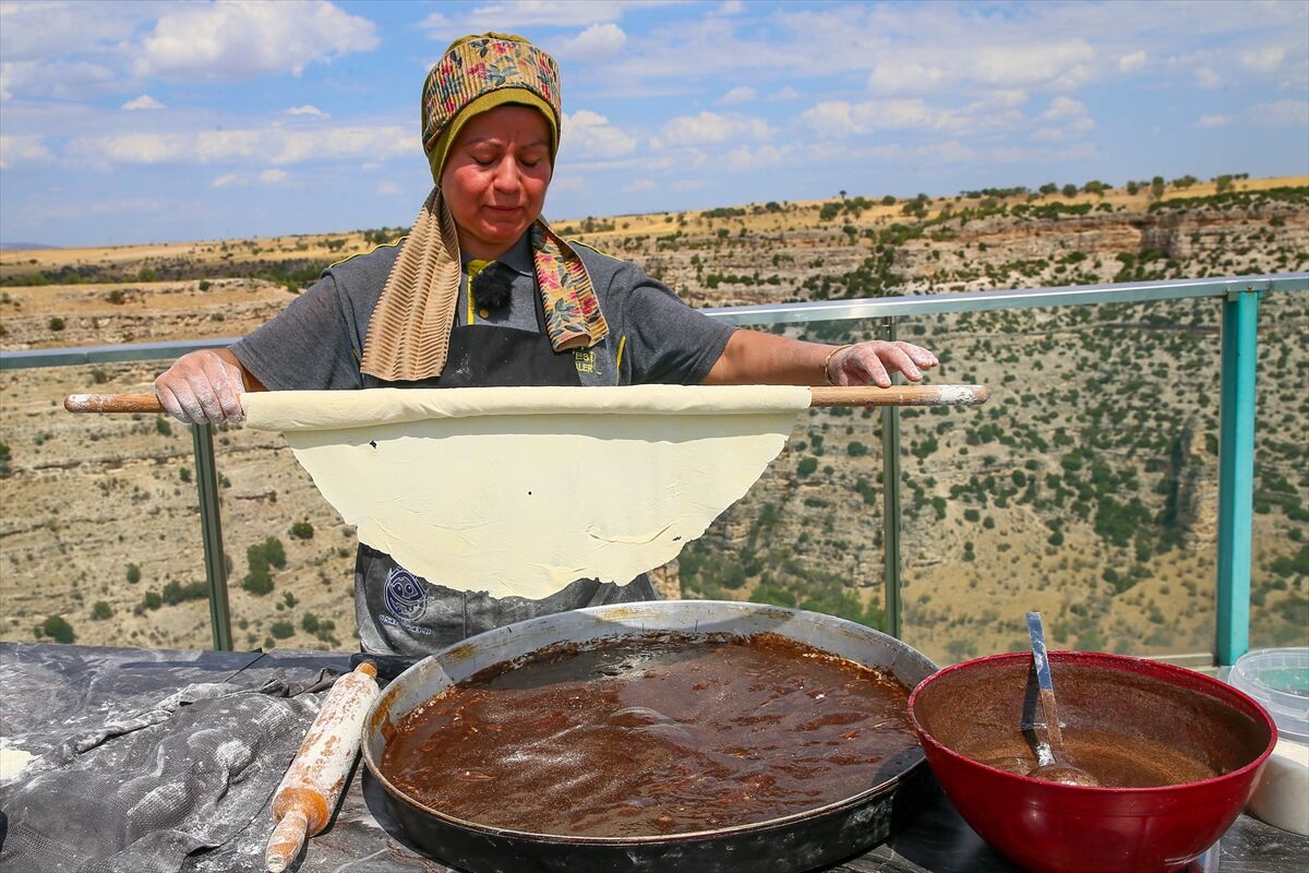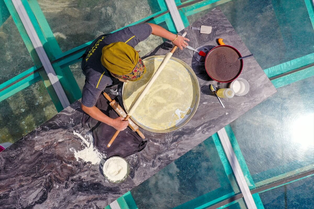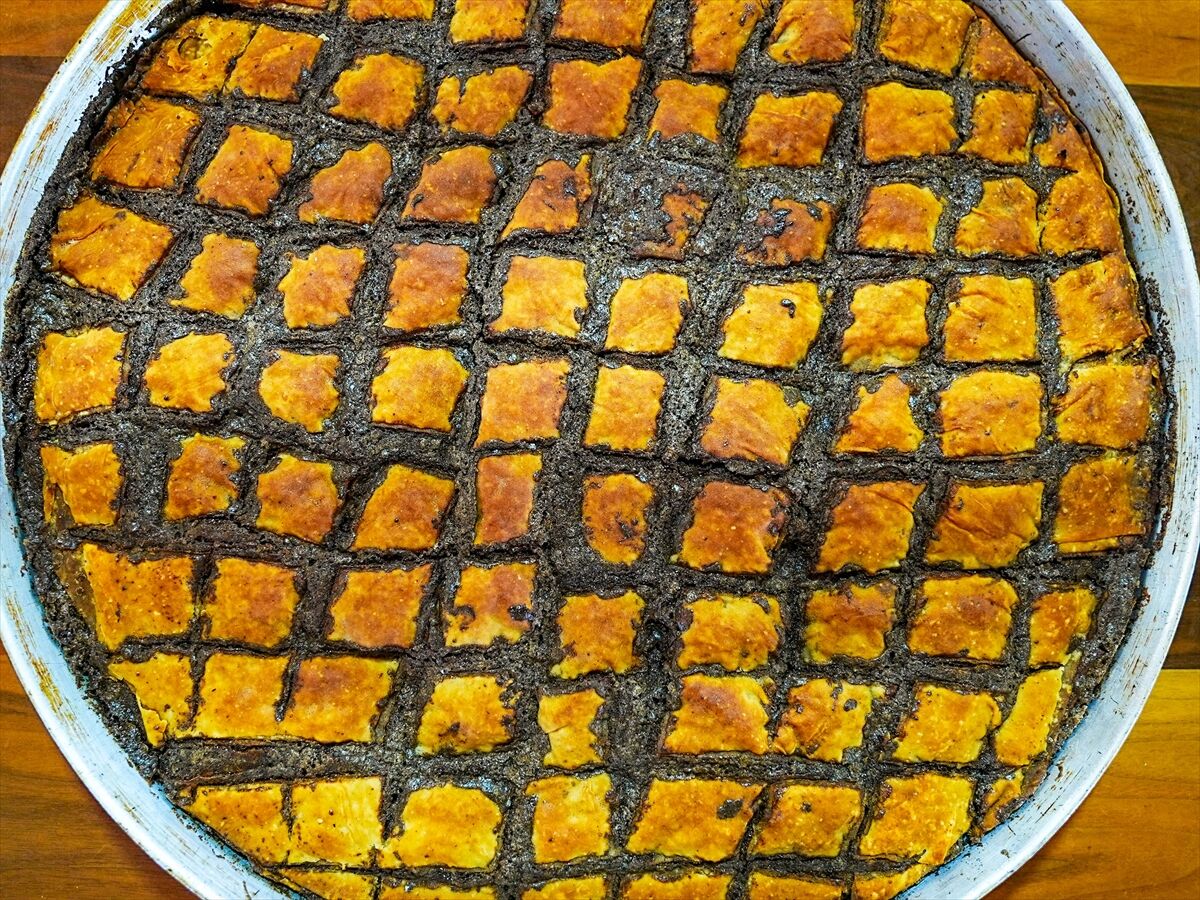Hazırlanan hamur 13 eşit parçaya bölünür. Tepsinin tabanı fırça yardımıyla sıvı yağ ile tamamen yağlanır. Hamurlar ince yufka şeklinde açılır. İlk yufka tepsiye yerleştirilir ve üzeri yağlanır. İkinci yufkada da aynı işlem uygulanır. Üçüncü yufkanın üzerine hazırlanan iç harçtan 3 kepçe dökülür ve yayılır, ardından yarım avuç kadar toz şeker eklenir. Bu işlem 11. yufkaya kadar devam eder. 12. ve 13. yufkada ise yalnızca yağlama yapılır.