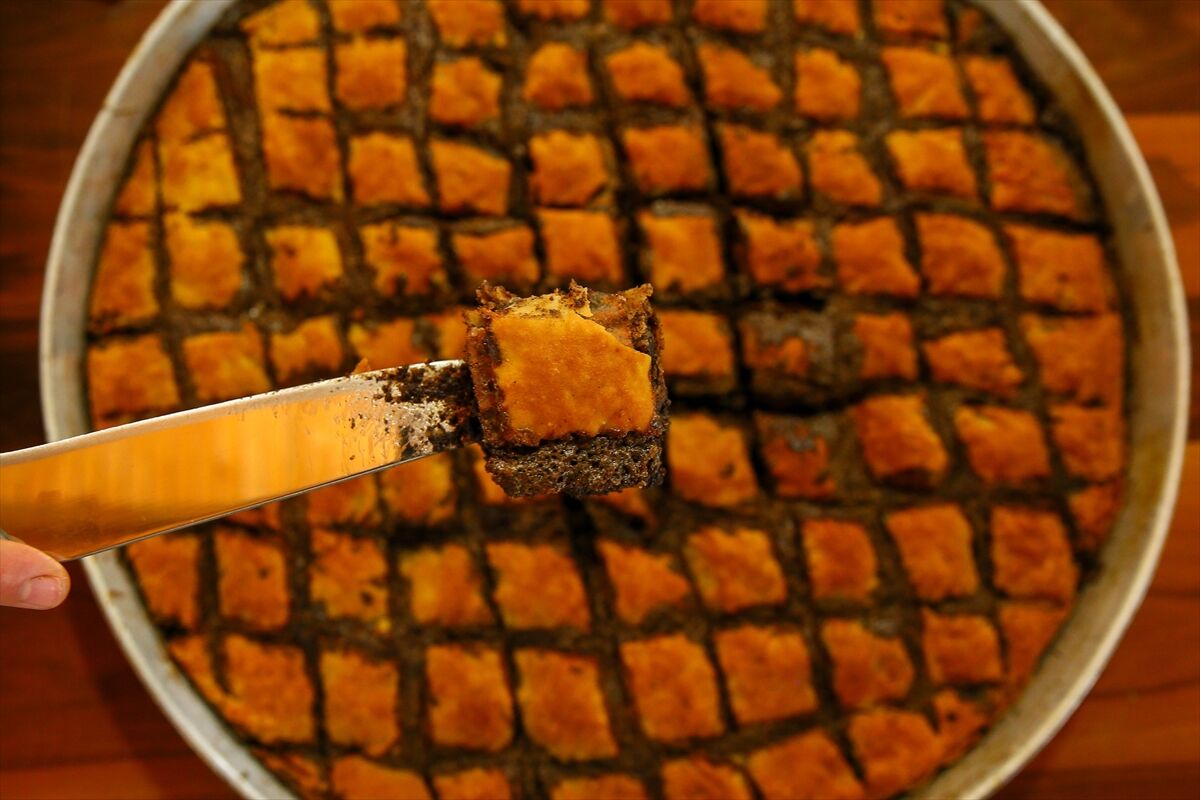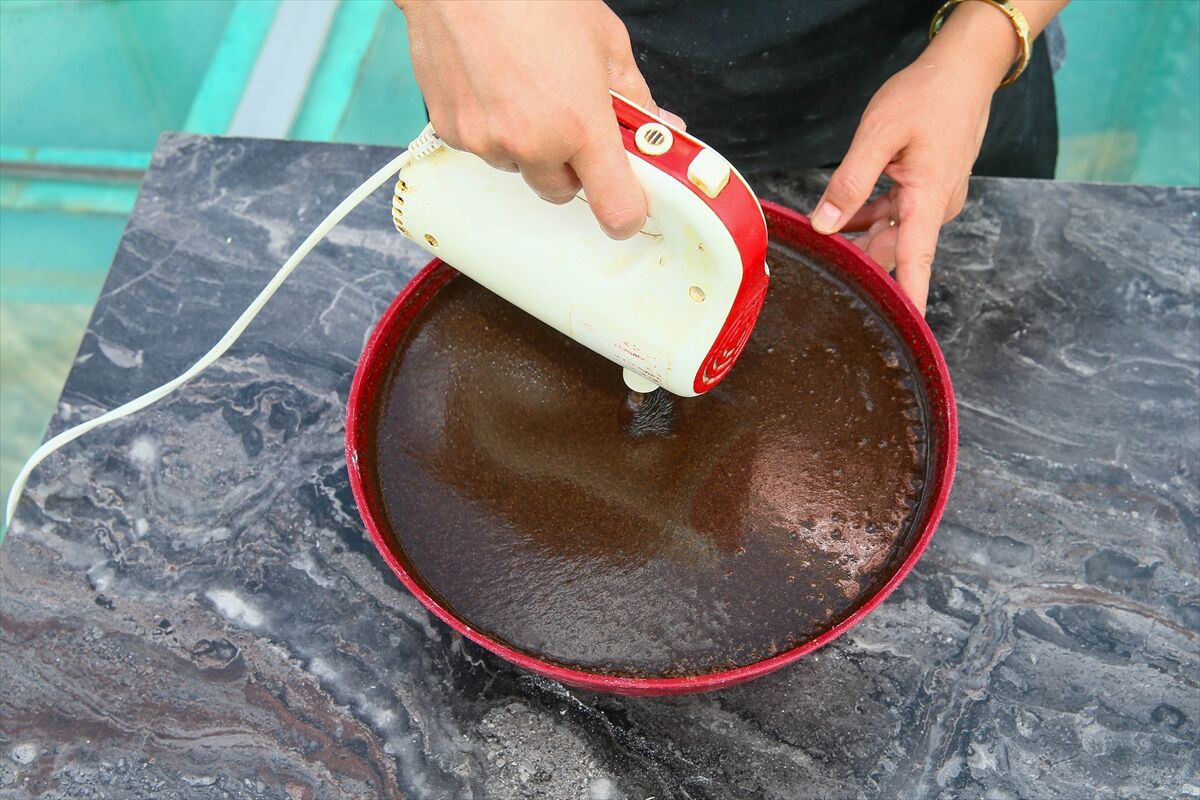 Derin bir kaba siyah haşhaş, susam ezmesi, toz şeker ve kabartma tozu konur. Üzerine su eklenir ve toz şeker eriyene kadar mikser yardımıyla karıştırılır.