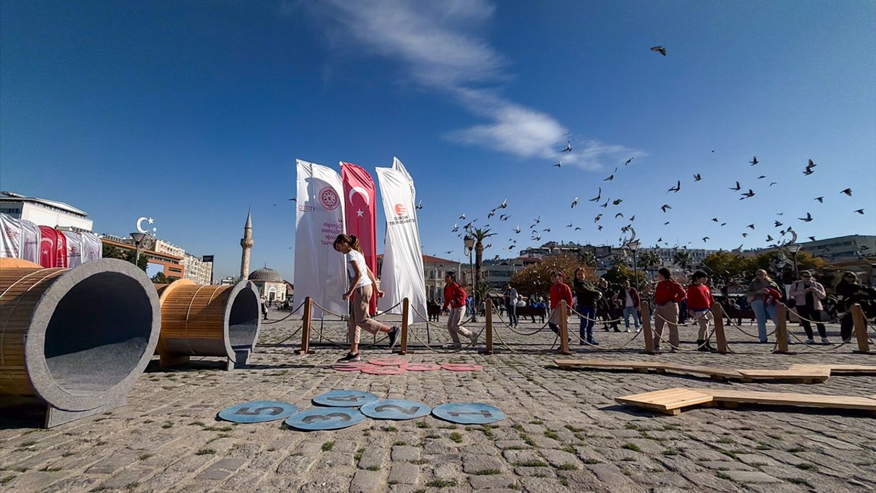 Konak Atatürk Meydanı'na konuşlandırılan tırda bir araya gelen çocuklar, geleneksel oyunlar oynadı.