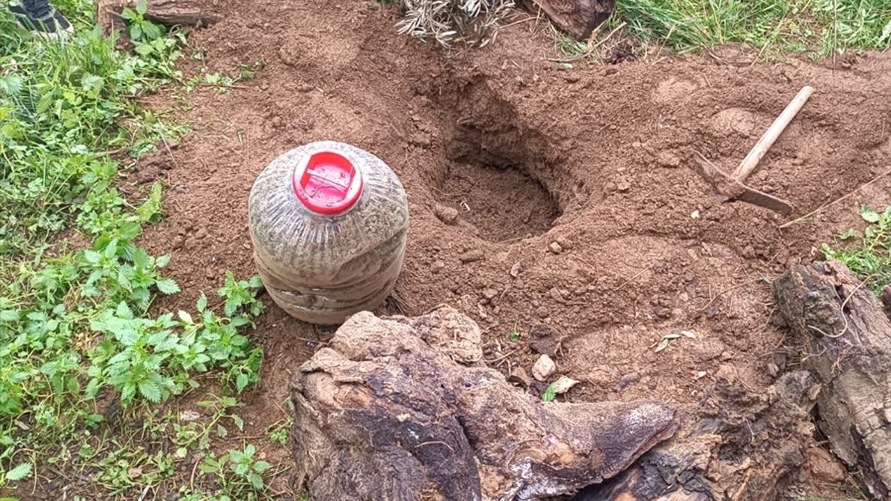 Ev ve bahçede yapılan aramada, toprağa gömülmüş plastik bidonlarda 2 kilo 750 gram esrar ele geçirildi.