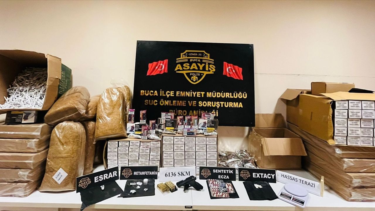 İlçe Emniyet Müdürlüğü ekipleri düzenledikleri operasyonda, bir adreste, ruhsatız tabanca, bir miktar uyuşturucu, 82 bin 500 doldurulmuş makaron, 16 kilogram nargile tütünü, 10 elektronik sigara, 40 kilo kıyılmış tütün ele geçirdi.