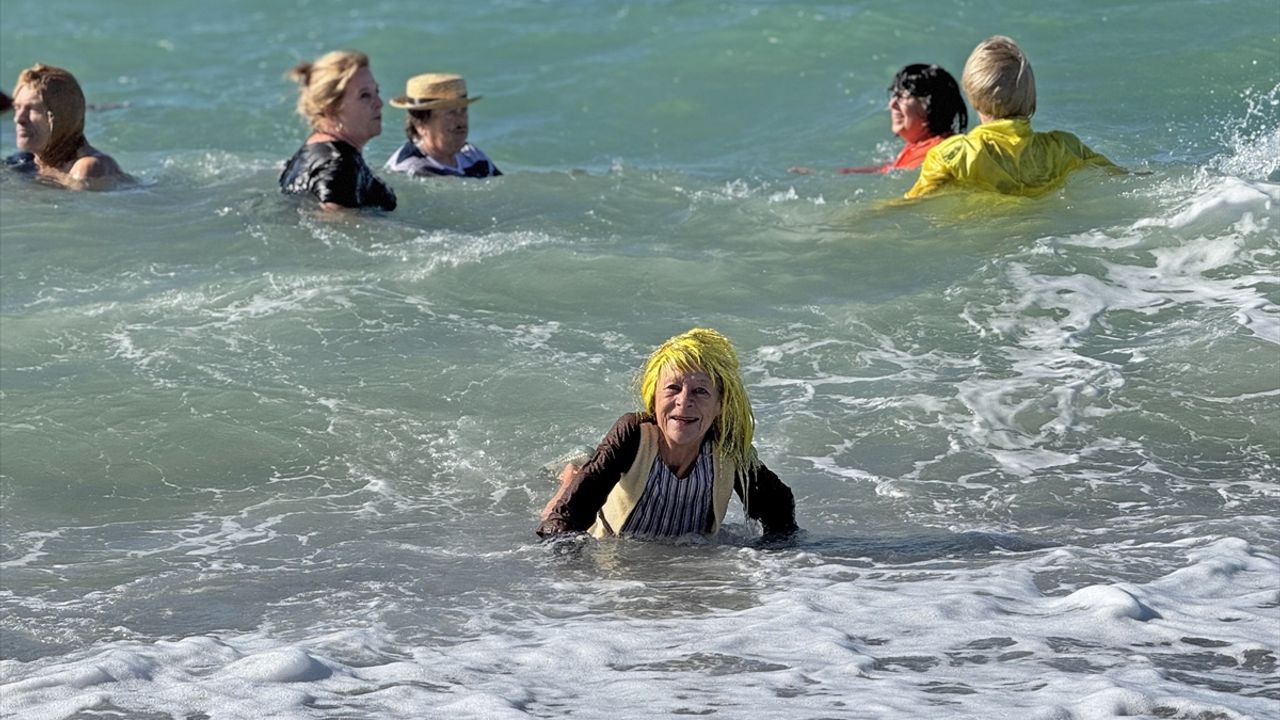 Hazırladıkları farklı kostümleri giyen katılımcılar, geri sayımın ardından 8 derecelik rüzgarlı havada denize girdi.