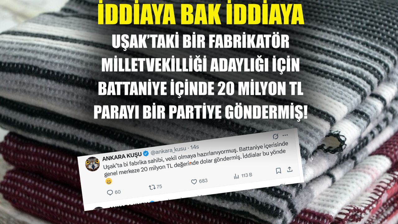 Ankara Kuşu isimli Ankara’daki siyasi partilerden kulis bilgiler aktaran ve zaman zaman belediyelere yönelik operasyonlarla ilgili farklı paylaşımlar yapan X kullanıcısı, Uşak için ilginç iddialar ortaya attı. Uşak Belediye Başkanı Özkan Yalım’a yapılan operasyonlarla ilgili daha öncesinde bazı paylaşımları olan Ankara Kuşu isimli X kullanıcısı, Uşak’taki bir fabrika sahibinin battaniye arasında konmuş 20 milyon TL’yi bir siyasi partiye gönderdiğini aktardı.
