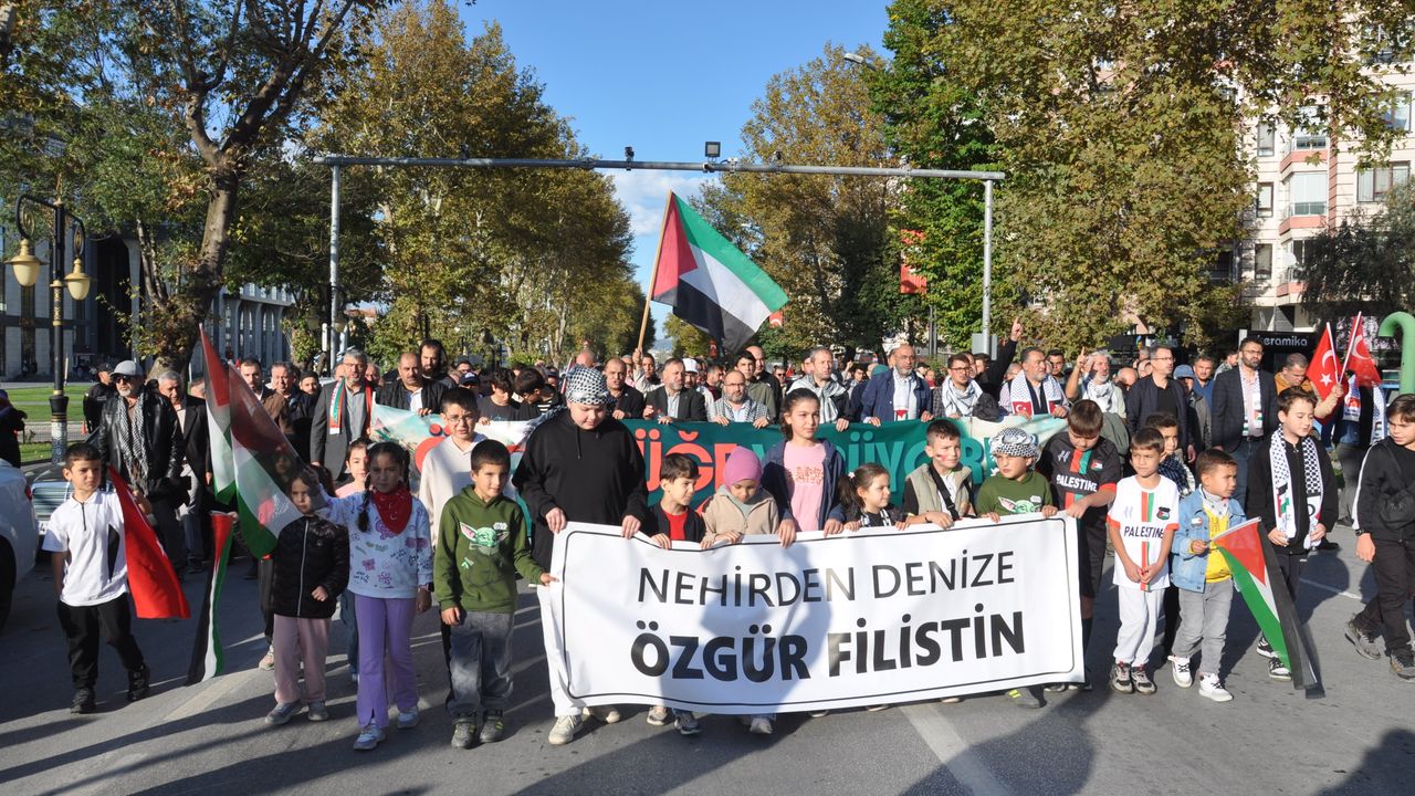 Kütahya Belediyesi önünde toplanan vatandaşlar, ellerinde Türk, Filistin bayrakları ve pankartlarla Atatürk Bulvarı'ndan Zafer Meydanı'na kadar sloganlar atarak yürüdü.