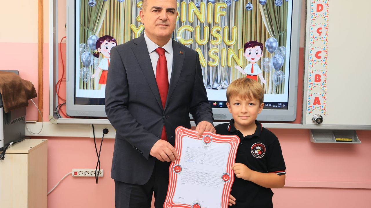 Öğrencilere karne ve hediyelerini, Vali İdris Akbıyık, Menteşe Kaymakamı Mehmet Eriş, Milli Eğitim Müdürü Emre Çay verdi.