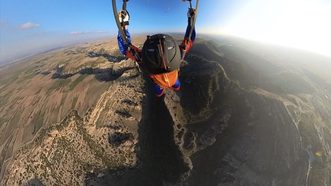 Özçelik, atlayışın ardından Türk bayrağı motifli paraşütüyle Ulubey Kanyonu'nun zemininde belirlenen alana başarılı bir iniş yaptı.