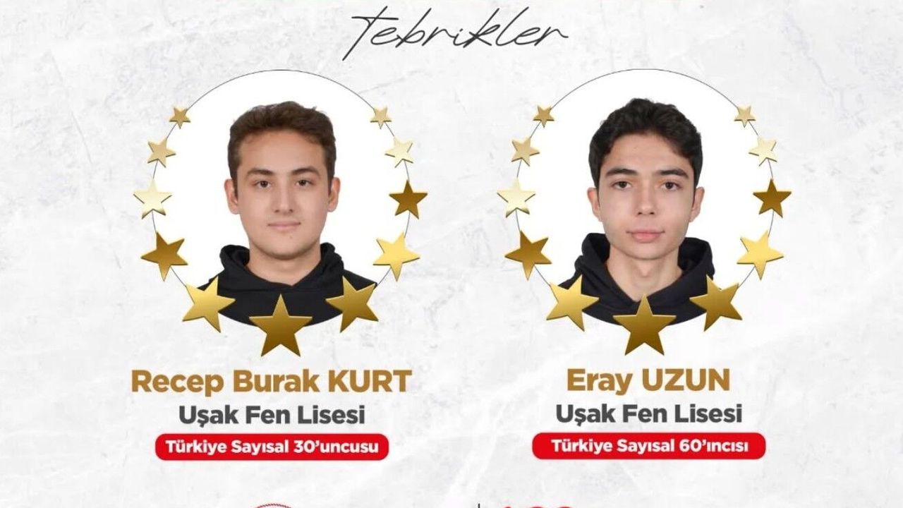 Uşak Fen Lisesi öğrencilerinden Recep Burak Kurt ve Eray Uzun’un Milli Savunma Üniversitesi sınav sonuçlarına göre Türkiye genelinde sayısalda 30’uncu ve 60’ıncı oldukları bildirildi. Uşak Fen Lisesi’nde eğitim gören Recep Burak Kurt ve Eray Uzun’un ilk 100’e girmesi, kentte büyük bir sevince yol açarken, Uşak Fen Lisesi yöneticileri, büyük bir gurur duyduklarını kaydetti.