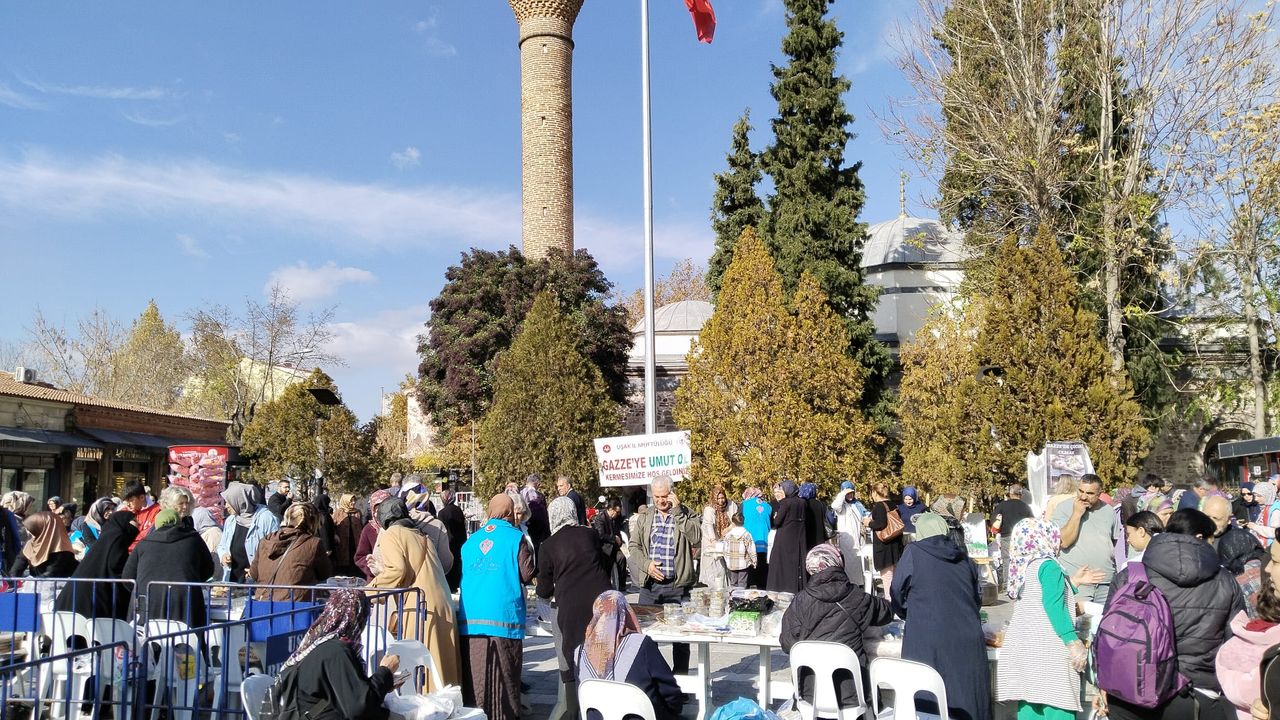 Uşak İl Müftülüğü’ne bağlı Türkiye Diyanet Vakfı’nın Uşak Kadın Kolları, Ulu Camii’nin önünde bugün ve yarın Gazze Yararına Hayır Çarşısı kurdu. Uşak İl Müftülüğü’nün koordinasyonunda yapılan Gazze Yararına Hayır Çarşısında, kadınlar yaptıkları yiyecek ve içecek türü ürünler ile el örmesi giysileri satışa çıkardı. Burada çay, kahve, et pilav, keşkek, börek ve pasta türü yiyecekler yoğun bir şekilde satılıyor. Uşak Ulu Camii’nin önündeki meydanda toplanan kadınlar, masaların üzerinde satılan ürünleri sergiliyorlar. Toplanan paraların Gazze yararına kullanılacağı belirtilirken aynı zamanda 5601’e kısa SMS atılarak da destek olunabileceği bildirildi. Atılan her bir mesajda Gazze yararına 25 TL para kesileceği ve bu paranın ihtiyaç sahibi Filistinli mazlumlara verileceği ifade edildi.