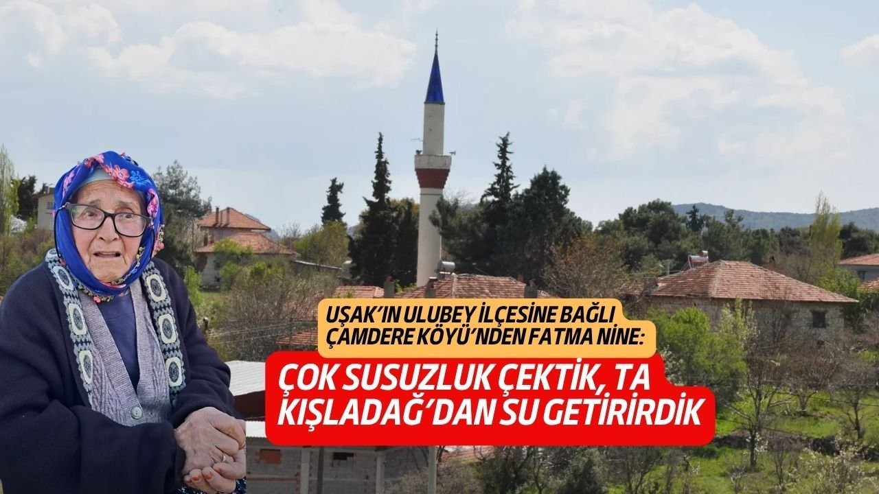 Uşak Tanıtım ve Kültür Gönüllüleri Derneği Başkanı Mehmet Keyvanoğlu, Ulubey Çamdere köyünü ziyaret etti ve burada yaşanan susuzlukla ilgili 86 yaşındaki Fatma Çevikdal ile sohbet etti. Fatma Çevikdal’a yıllar önce bölgede yaşanan susuzlukla ilgili sorular soran Mehmet Keyvanoğlu, bölgenin suya ve yola kavuşmasıyla ilgili zorlu sürece dair bilgiler aldı. Fatma Çevikdal, kendi gençlik yıllarında sabahtan akşama kadar tarlada çalıştıklarını ve iş bittiğinde su olması Allah’a hep dua ettiklerini ifade etti. Çevikdal’ın verdiği bilgiler arasında dikkat çeken noktalardan biri de Ulubey ve Eşme’de sınırları olan Kışladağ’dan suyun getirilmesi oldu.