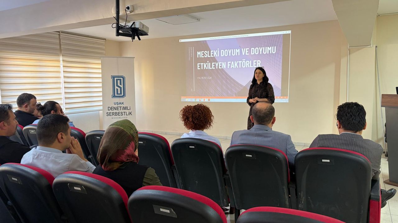 Uşak Üniversitesinde psikolojik danışmanlık ve rehberlik biriminde görev yapan psikolog Sevgican Dağlı ve Merve Uçak tarafından Denetimli Serbestlik Müdürlüğü personellerine yönelik seminer gerçekleştirildi. Eğitim programında çalışma hayatında motivasyonu artıran unsurlar, mesleki doyumun bileşenleri ve bireysel özyeterlilik algısının iş performansına etkisi ele alındı.