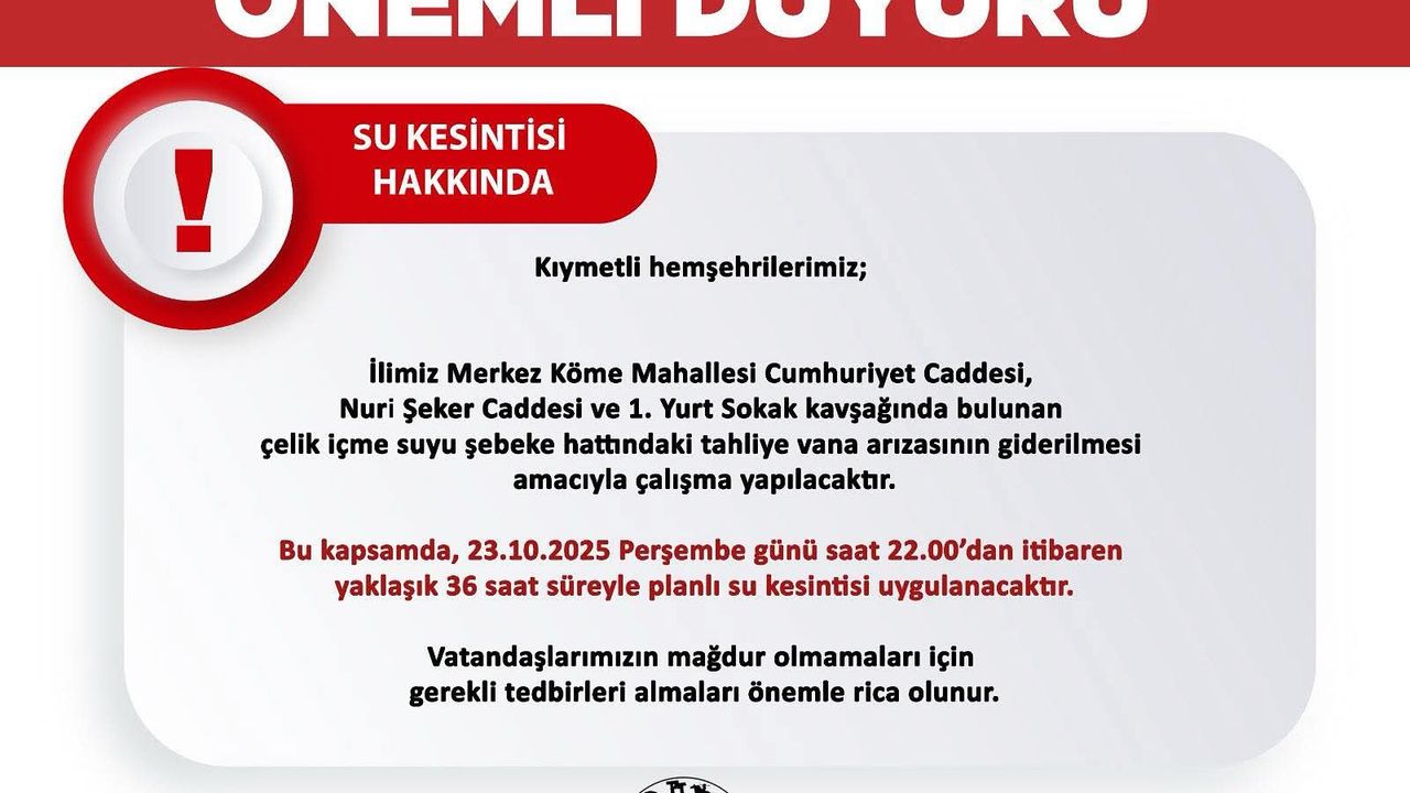 Uşak Belediyesi Nuri Şeker Caddesinde bakım çalışması nedeniyle 36 saatlik su kesintisine gidecek.