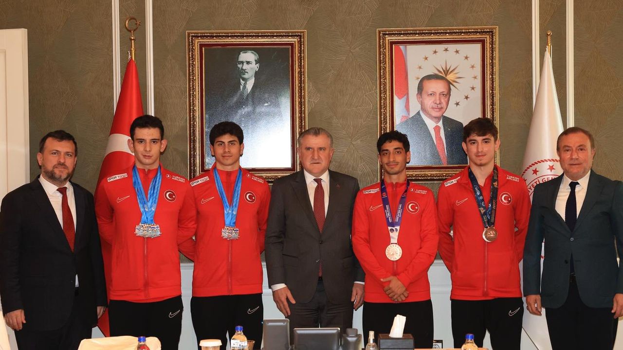 Hindistan’daki Dünya Para Atletizm Şampiyonası’nda 800 Metre koşu branşında dünya üçüncülüğü kazanan Mehmet Emin Eğilmez ile gülle atma branşında dünya ikinciliğini elde eden Ebrar Keskin ve antrenörleri Sevda Kalkan’ı ağırlayan Bakan Bak’ın makamında şu sporcular da kabul edildi;